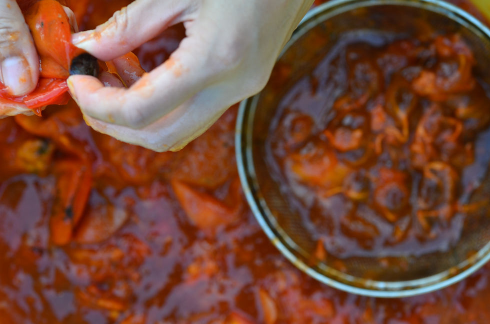種はザルに。手でつぶしながら、皮ごと入れていきます。
